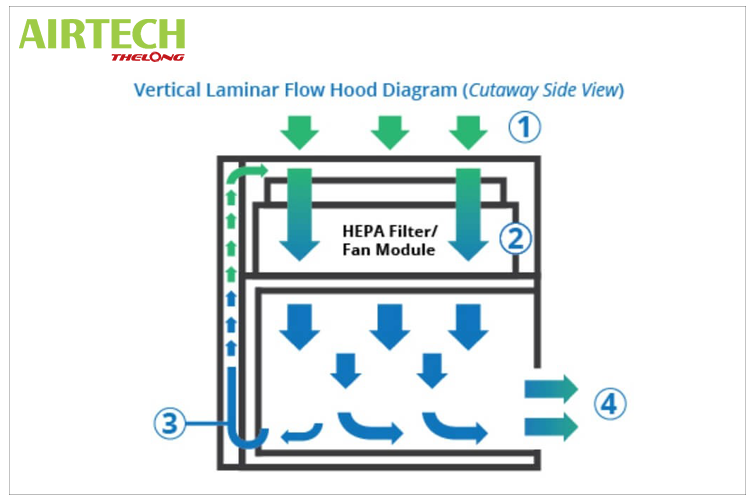 Luồng khí sạch thổi ra có thể là luồng khí ngang Horizontal Laminar Flow thổi từ phia sau ra phía trước người thao tác) hoặc dòng khí dọc Vertical Laminar Flow thổi từ phía trên xuống bề mặt làm việc.
